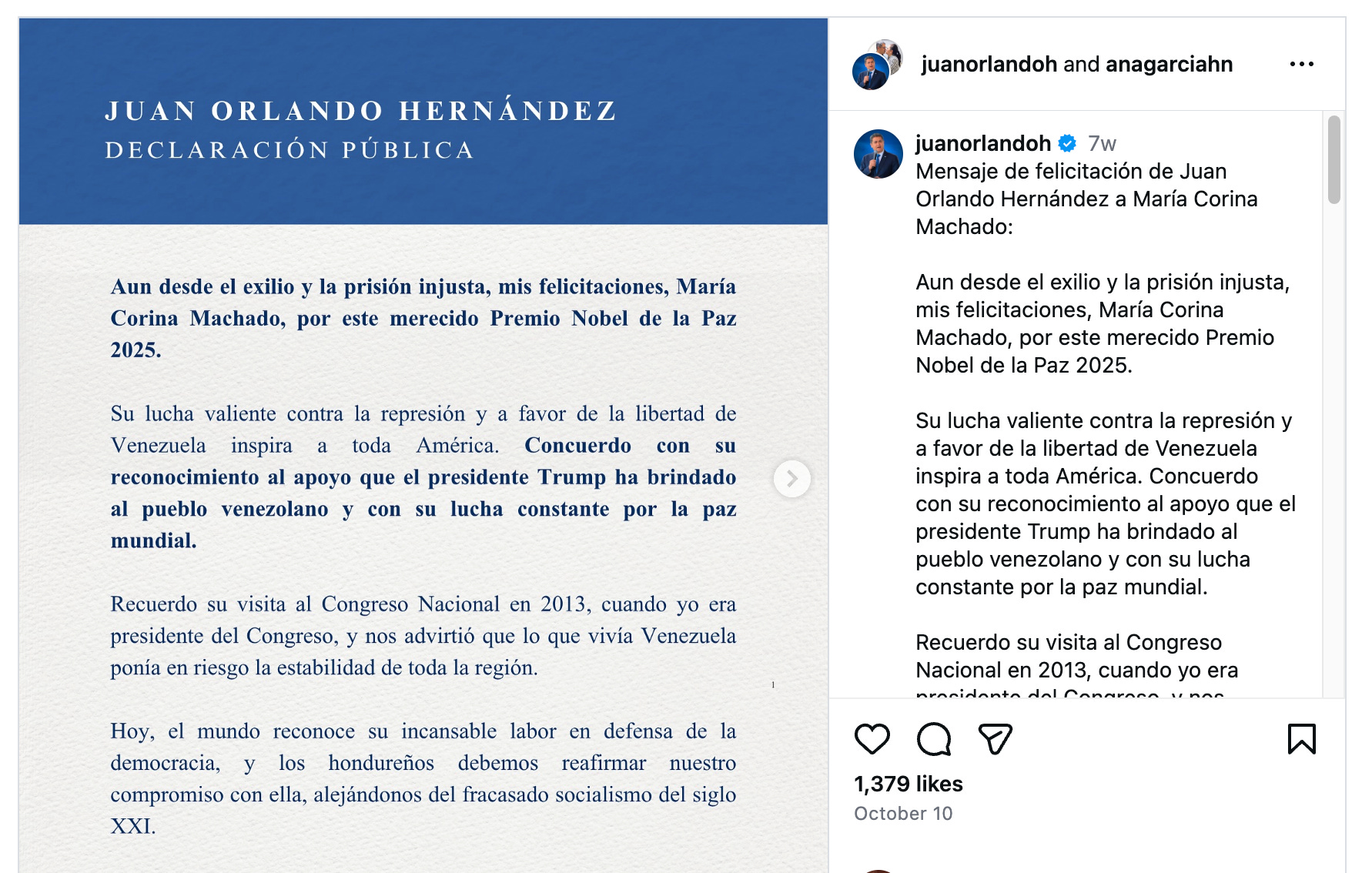 Here’s an interesting, and official-looking, “declaración pública” that Hernández posted on Instagram from prison, congratulating his friend, Maria Corina Machado, on her Nobel Peace Prize…