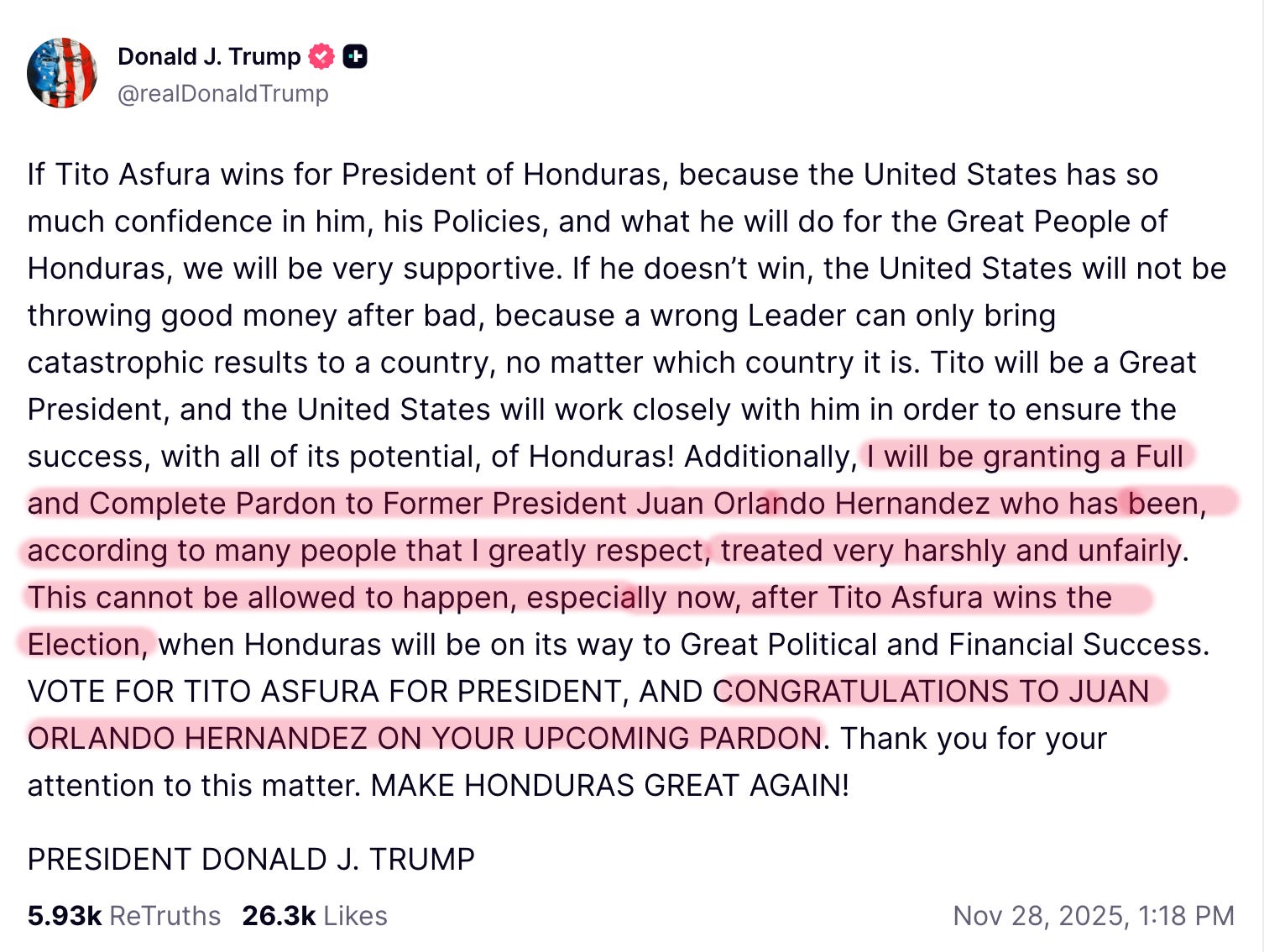 In her usual fashion, Leavitt spun a story on behalf of Trump that was intended to bolster a narrative to which we are not privy, but which will inevitably reveal itself. In her press briefing, Leavitt conveniently omitted the part of the Hernández story that included Emil Bove III, a Republican and huge Trump loyalist. Bove had been part of the original investigation into the goings on of Juan Orlando Hernández and Juan “Tony” Antonio Hernández, and was the lead prosecutor on Tony’s case, presenting the closing arguments at his trial. FYI, Tony, like his brother, Juan, had been a lawyer, drug and arms trafficker, and a politician, serving as a member of the National Congress of Honduras from 2014- 2018. Both Tony and Juan were members of Partido Nacional de Honduras, of which Trump is apparently a huge supporter, per his Truth Social post above. Partido Nacional had been widely associated with the creation of a narco-state within Honduras, and much of its funding came through embezzlement. This party is renowned for its misuse of public funds and is linked to major drug trafficking entities, including Los Cachiros and the Atlantic Cartel. Trump’s new buddy, Tito Asfura, is that party’s candidate for President.