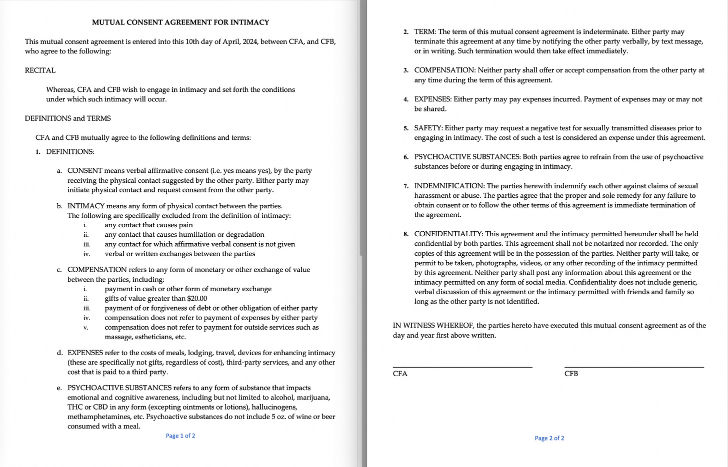 My friend Brigitte’s contract wasn’t intended to be legally binding; the expectation was just that it would be an agreement between consenting adults laying out the ground rules for an intimate relationship. Still… loads of missing bits, which I’m going to enumerate, as she loves numbered lists: